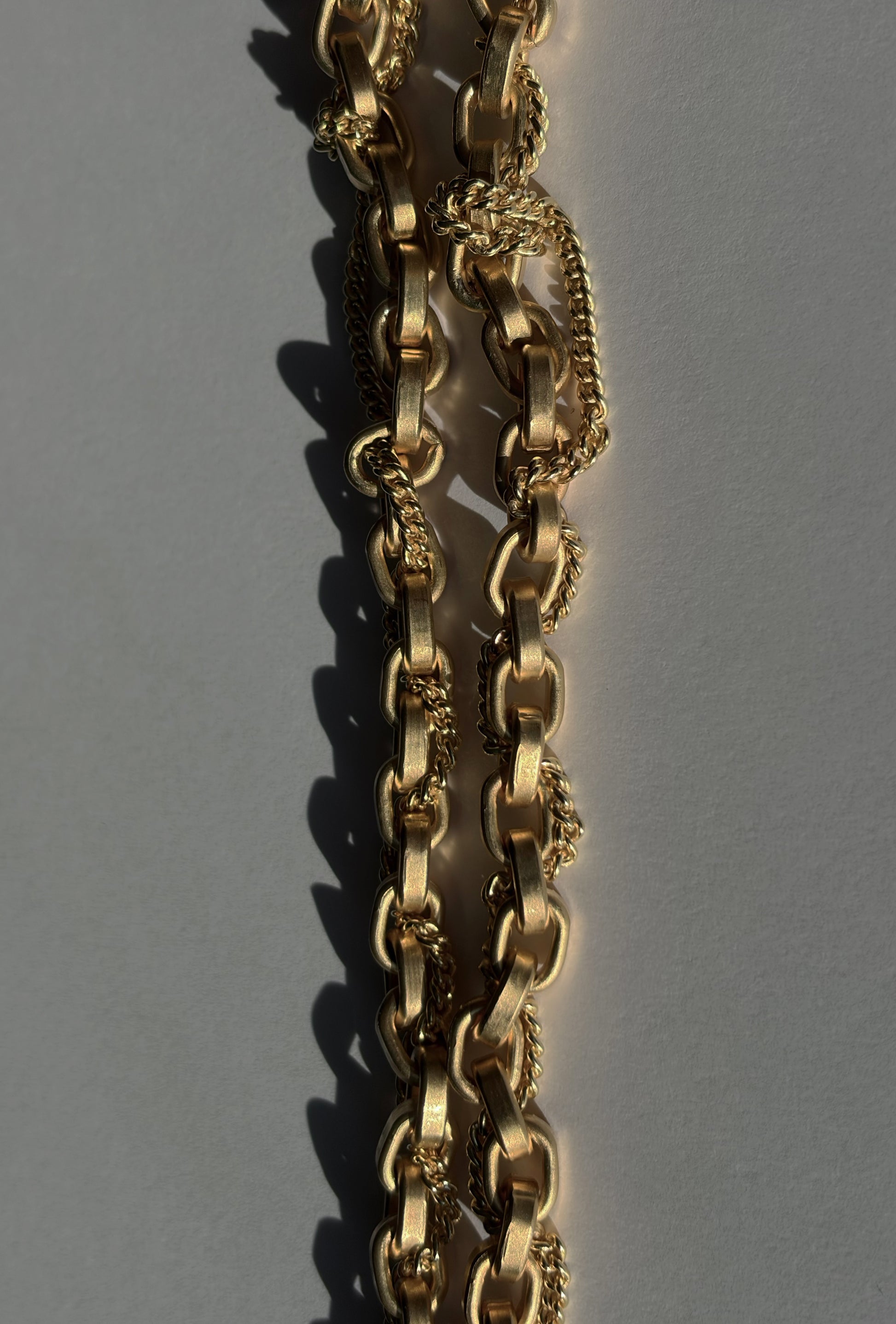Fluid and luminous, defined by AKKESOIR’s signature interlaced chain design. A modern statement that follows the body with quiet precision.